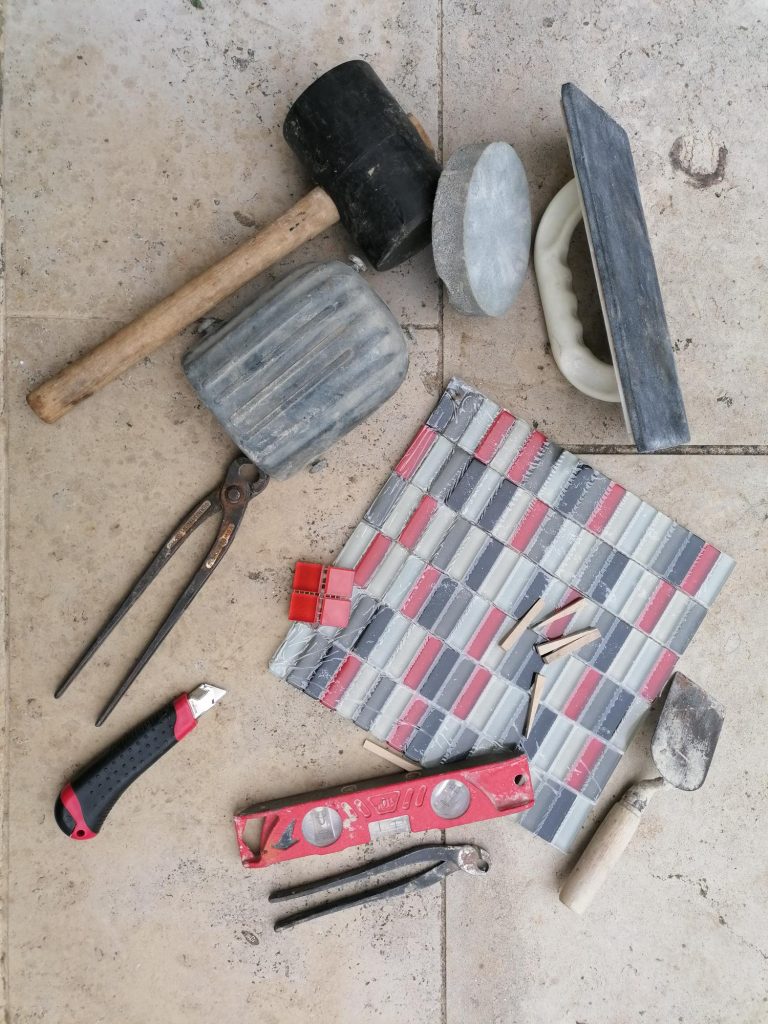 Herstellen Fliesenmusters aus Mosaikfliesen im Schachbrettmuster aus mindestens zwei unterschiedlichen Fliesenfarben. Fliesen sind besonders robust und pflegeleicht und eignen sich somit besonders für den Eingangsbereich im Kindergarten.